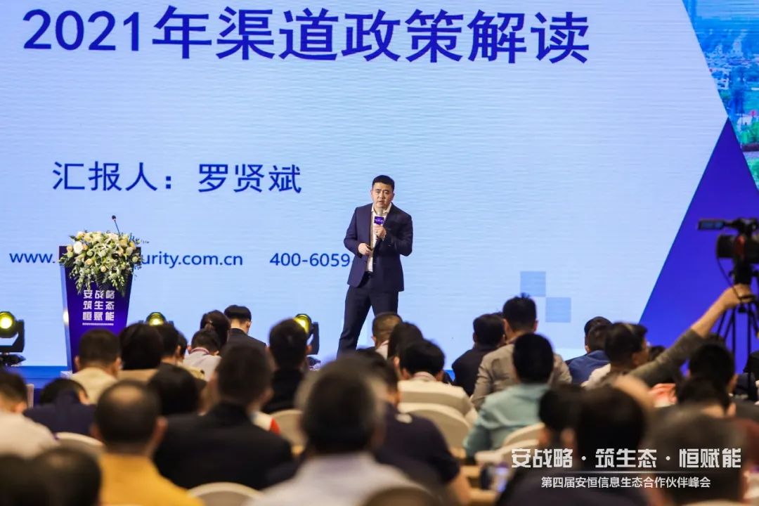 安恒信息副总裁&生态合作业务中心总经理罗贤斌向参会嘉宾全面解读2021年安恒信息渠道合作政策,阐明安恒信息将渠道事业部升级为生态合作业务中心深刻内涵,对渠道结构体系完善、聚焦优质伙伴、渠道政策亮点、渠道产品亮点、渠道百城活动、立体赋能等方面进行了全面阐述。安恒信息将构建公平公正公开透明的渠道体系,不断优化组织架构、考核体系和系统流程,更加开放地拥抱合作伙伴,吸纳不同类型的伙伴共谋发展,携手奋进推动生态合作的深入,通过各项改革措施支撑渠道战略落地执行。