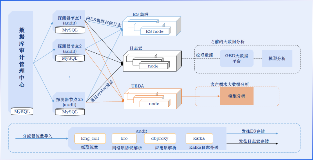 针对上述挑战,安恒信息经过深入调研,为客户量身定制了分布式解决方案,并结合用户的ES存储集群,创建了专为大型企业设计的数据库审计模式: