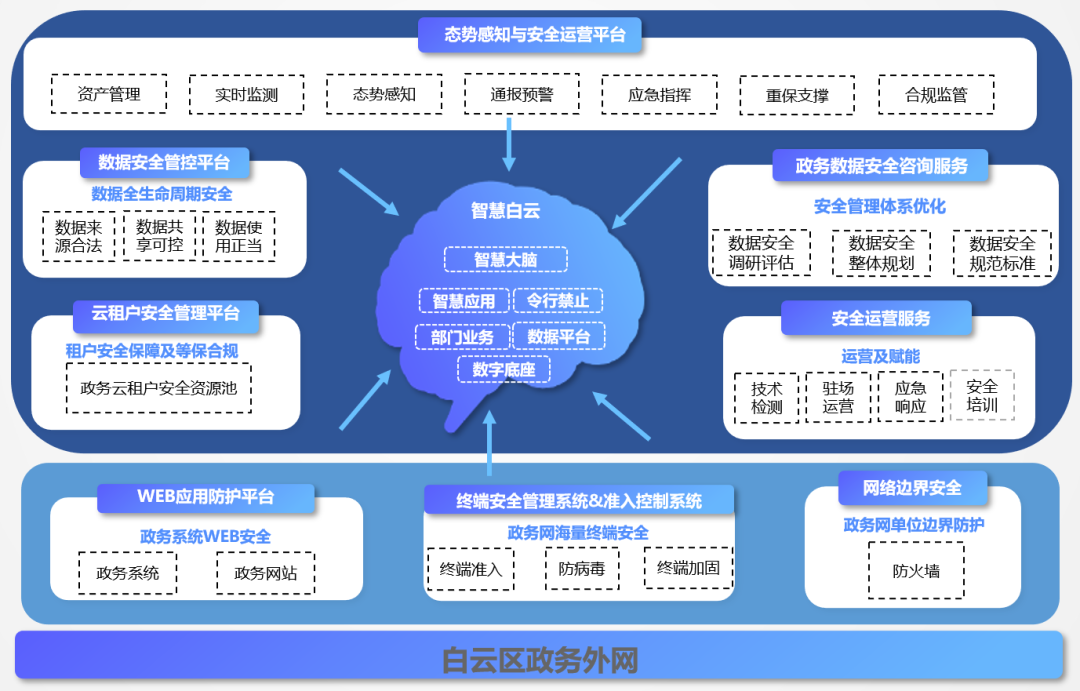 因此亟需开展“智慧白云”安全体系建设工作,需要统筹“智慧白云”各子系统架构与数据的安全边界,以“安全、合规、可控”为实现目标,从管理机制、技术保障、安全运营等角度去构建立体化纵深防御体系,护航“智慧白云”体系和白云区政府数字化的健康发展。对此,安恒信息深度参与“智慧白云”安全体系建设,共同筑牢白云区数字政府网络安全防线。
