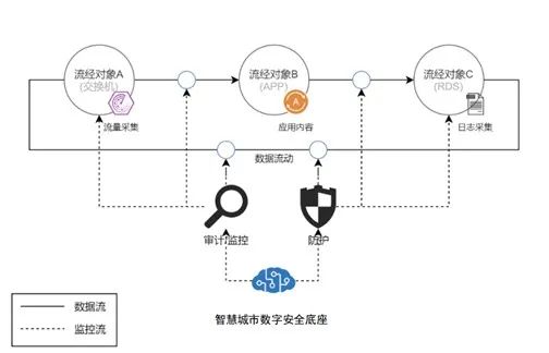 基于业务的数据安全监控,基于业务场景对其数据流经的节点按其属性和特点进行归类,根据数据流向,利用数据流节点进行可视化的拓扑配置和安全监管;