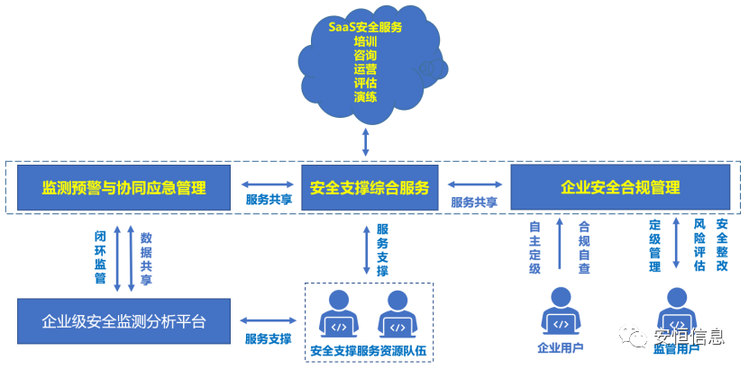 安恒信息以政策需求为出发点,结合工业互联网安全支撑保障实际需求,将工业互联网安全“监测预警与协同应急管理”、“工业互联网企业安全合规管理”和“工业互联网安全支撑综合服务”三大业务应用融为一体,以“工业互联网安全公共服务”为核心能力,为安全支撑保障部门和工业企业提供“双向赋能”。打造省、市工业互联网安全公共服务生态体系,逐步形成集约化工业互联网安全运营服务中心。