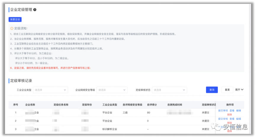 提供自主定级管理、符合性评估管理,帮助工业企业实现线上自主定级填报与状态跟踪,可根据自身企业类型和安全级别开展符合性自评估工作,提前掌握安全现状,开展相关安全整改工作,满足分类分级安全规范要求。
