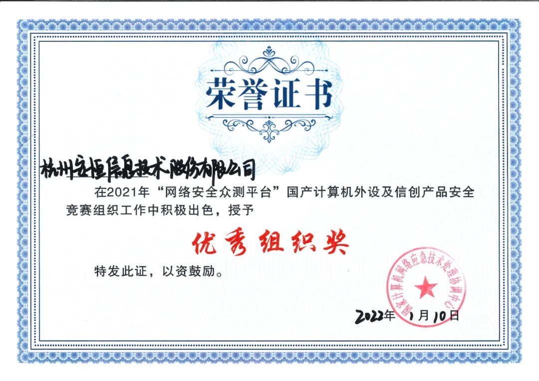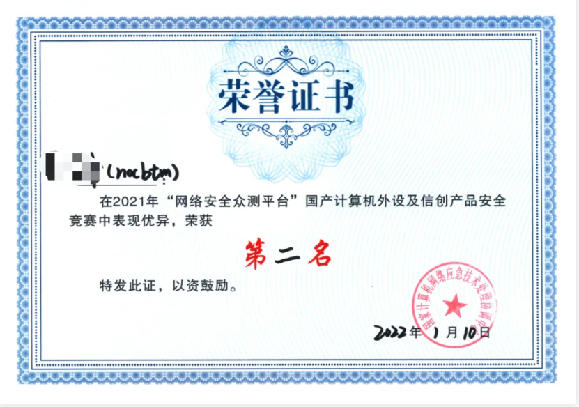近日,在国家计算机网络应急技术处理协调中心主办的“网络安全众测平台”国产计算机外设及信创产品安全竞赛活动中,安恒信息位列安全厂商漏洞总积分第二名,荣获主办方颁发的“优秀组织奖”荣誉证书;安恒信息海特实验室安全研究员“nocbtm”凭借出色表现获得测试人员漏洞总积分第二名。