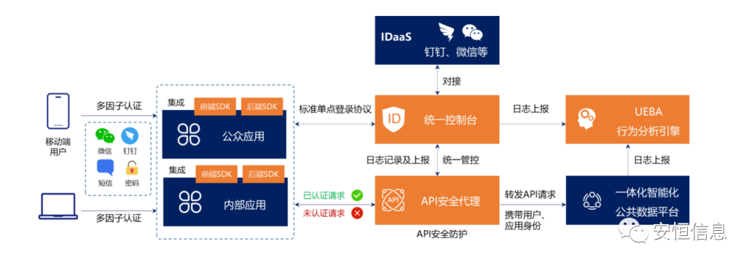 安恒信息零信任API安全管控解决方案依照多年以来在数据安全领域的积累,结合大数据安全分析能力基础,围绕“零信任”核心理念,通过拉通终端、用户、应用、接口、数据身份,引入可信身份认证、动态权限控制、数据脱敏、敏感数据识别等技术,对API访问请求实行持续信任评估和动态访问控制。