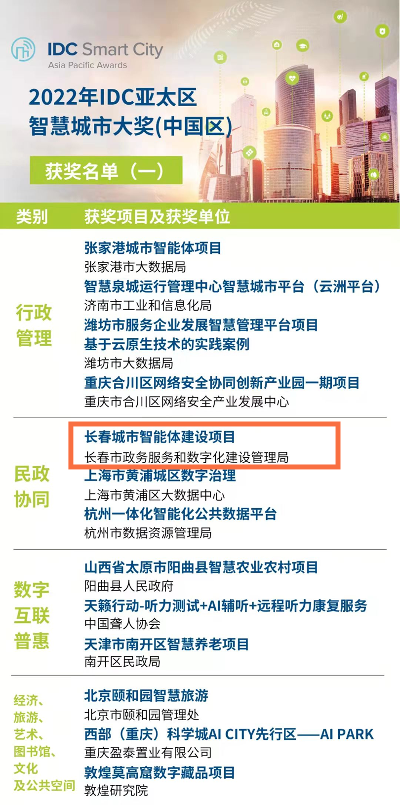 近日,2022年IDC亚太区智慧城市大奖(中国区)获奖名单公布,经过三个月的案例选拔、分析师评比、公众票选、专家评审,最终评选出14个智慧城市类别的杰出项目。由安恒信息参与建设和运营的“长春城市智能体”项目喜获“民政协同”类别奖项,成为城市创新的最佳实践范例之一。与此同时,长春市政务服务和数字化建设管理局向安恒信息致信感谢,对我们过硬的专业技能和高度负责的职业精神予以高度评价。