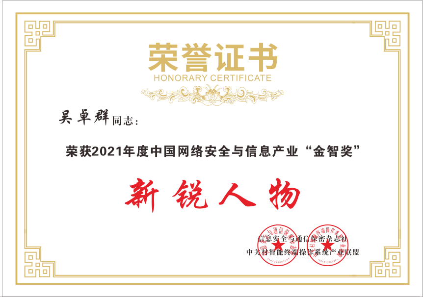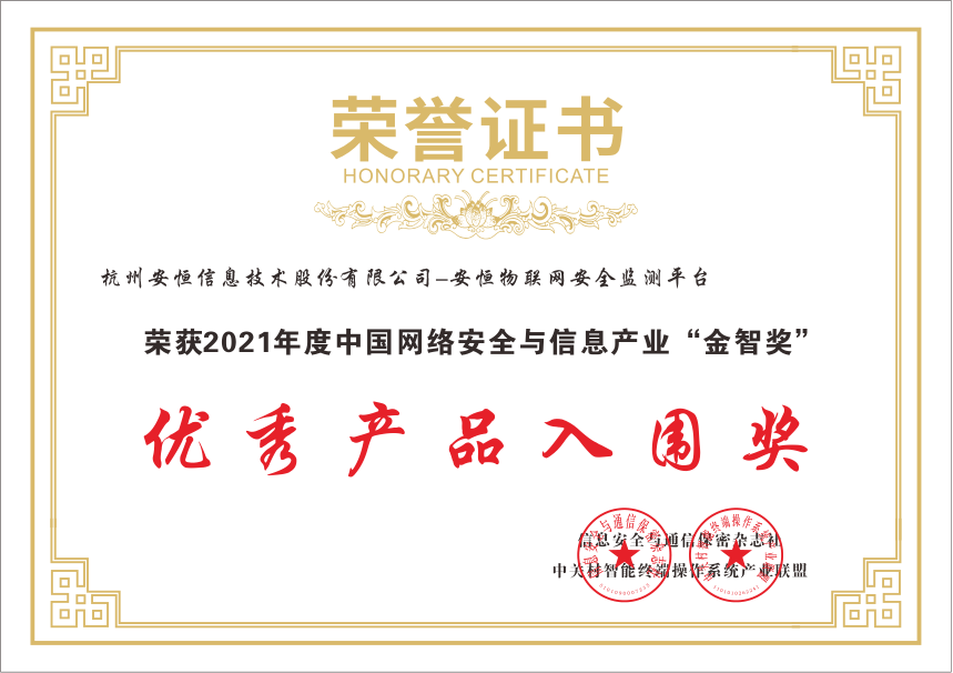 近日,由信息安全与通信保密杂志社主办,中关村智能终端操作系统产业联盟协办的2021年度“中国网络安全与信息产业金智奖”(以下简称“金智奖”)评选正式揭幕。安恒信息总经理吴卓群荣获“新锐人物”,安恒信息物联网安全监测平台荣获“优秀产品入围奖”。
