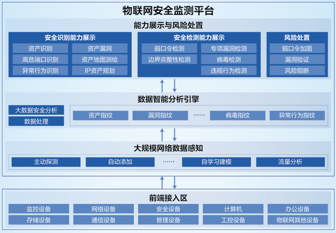 目前,物联网终端导致安全威胁事件频繁发生,物联网安全已经成为需要全球共同面对的网络安全威胁。面对物联网网络环境的特殊性、资产信息的明确性、业务数据的重要性以及强保密性的特点,需要更专业、更符合法律法规的物联网安全监测平台去解决目前物联网所面临的安全问题。