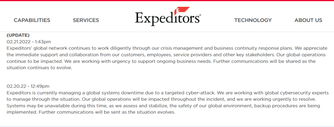 该事件对Expedit or s公司影响巨大,货运、海关与配送等业务面临停摆;Expedit or s公司表示:这是一次“可能对公司业务、收入、运营能力和商业声誉造成严重负面影响”的重大事件。