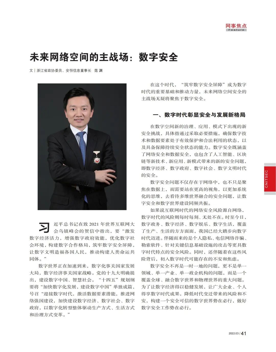 近日,中国信息安全杂志2022年第3期正式发布,浙江省政协委员、安恒信息董事长范渊题为《未来网络空间的主战场:数字安全》的文章收录其中。