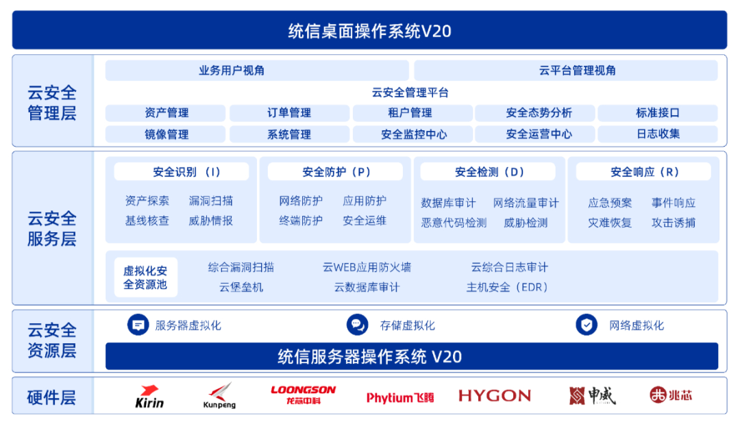 安恒信息对云计算进行了持续多年的深入研究和风险分析,结合自身在安全领域的经验及技术积累,基于统信操作系统的基础底座,打造了专门针对云上安全的产品——天池云安全解决方案。