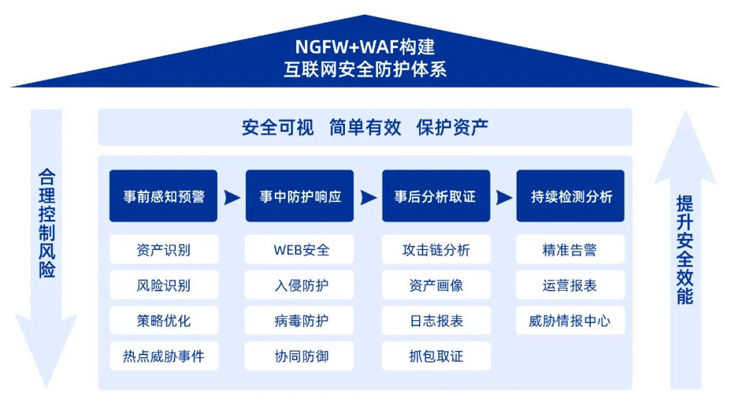 秉持安全可视、简单有效的理念,互联网出口安全检测联合解决方案通过明御安全网关与明御WEB应用防火墙以资产为视角,构建全流程防御的互联网出口安全防护体系,并融合入侵防御、病毒防护、上网行为管控、VPN、威胁情报等安全模块。