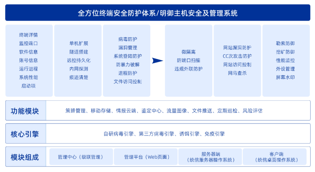 勒索病毒防御联合解决方案基于自主处理器、统信UOS操作系统和安恒信息自研的应用模块构建,是一个集成了丰富的系统防护与加固、网络防护与加固等功能的主机安全解决方案。