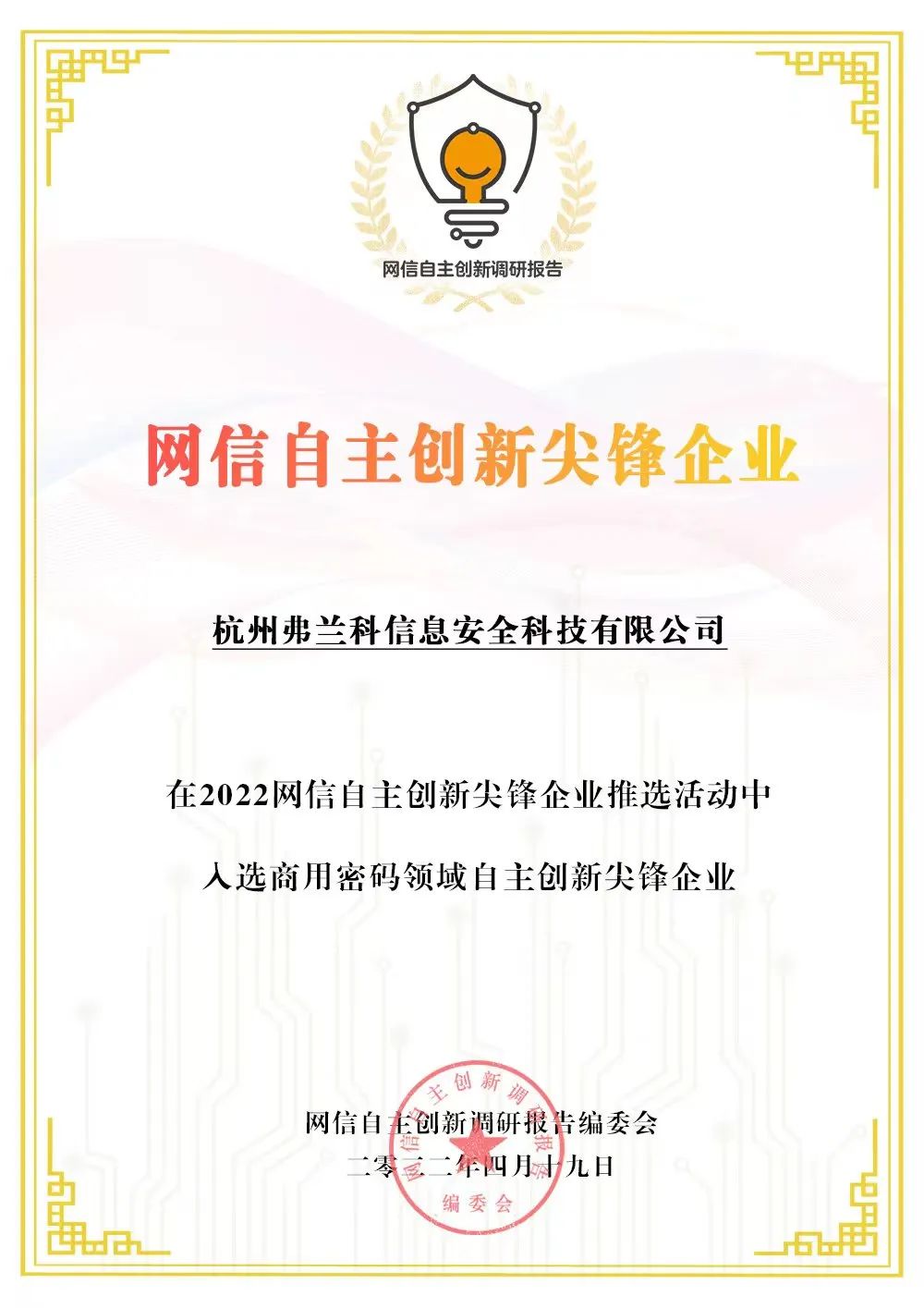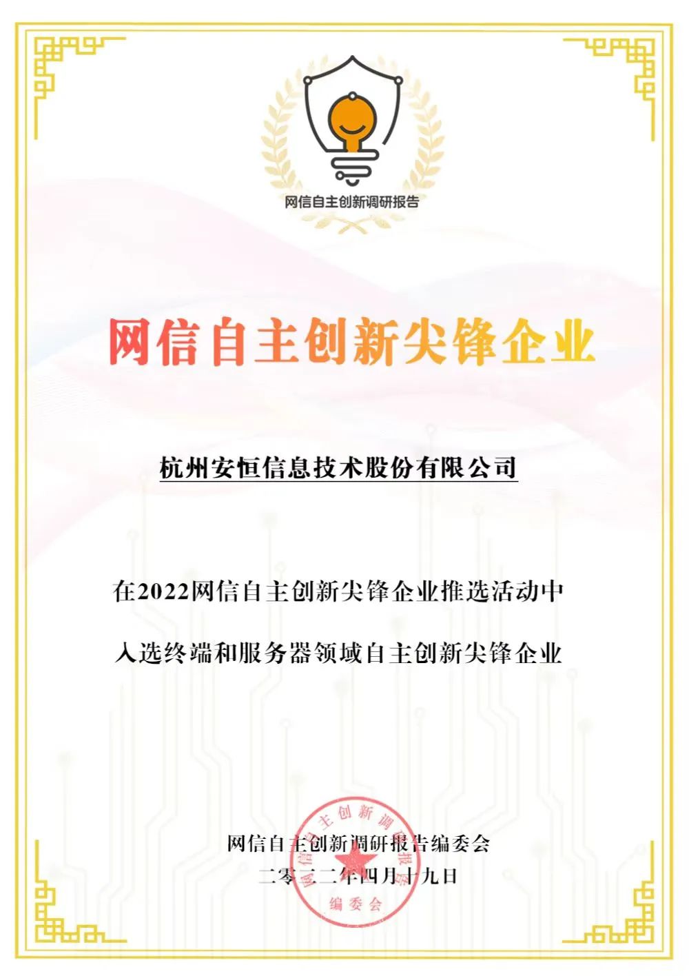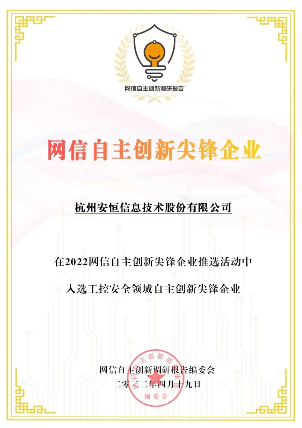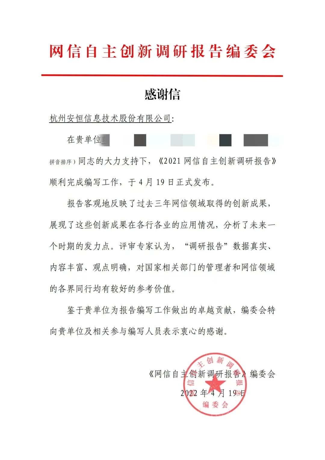 收获编委会感谢信,安恒信息入选网信自主创新尖峰企业