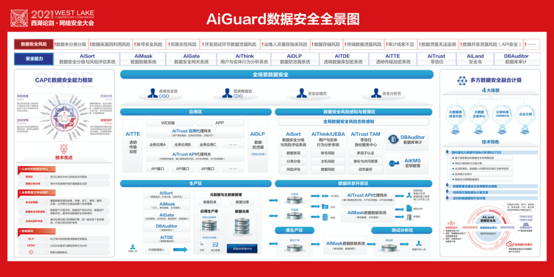 安恒信息站在时代与理论的前沿,从创立之初就关注数据安全,并在多年来不断完善、更新。2021年7月,在《数据安全法》实施前,发布数据安全整体解决方案,包含“CAPE”数据全生命周期防护体系、数据安全咨询服务体系、AiLand数据安全岛、AiTrust零信任解决方案、AiDSC数据安全管控平台、EDR与数据勒索防护等六大产品服务,上线“一网统管”数字安全系列产品。