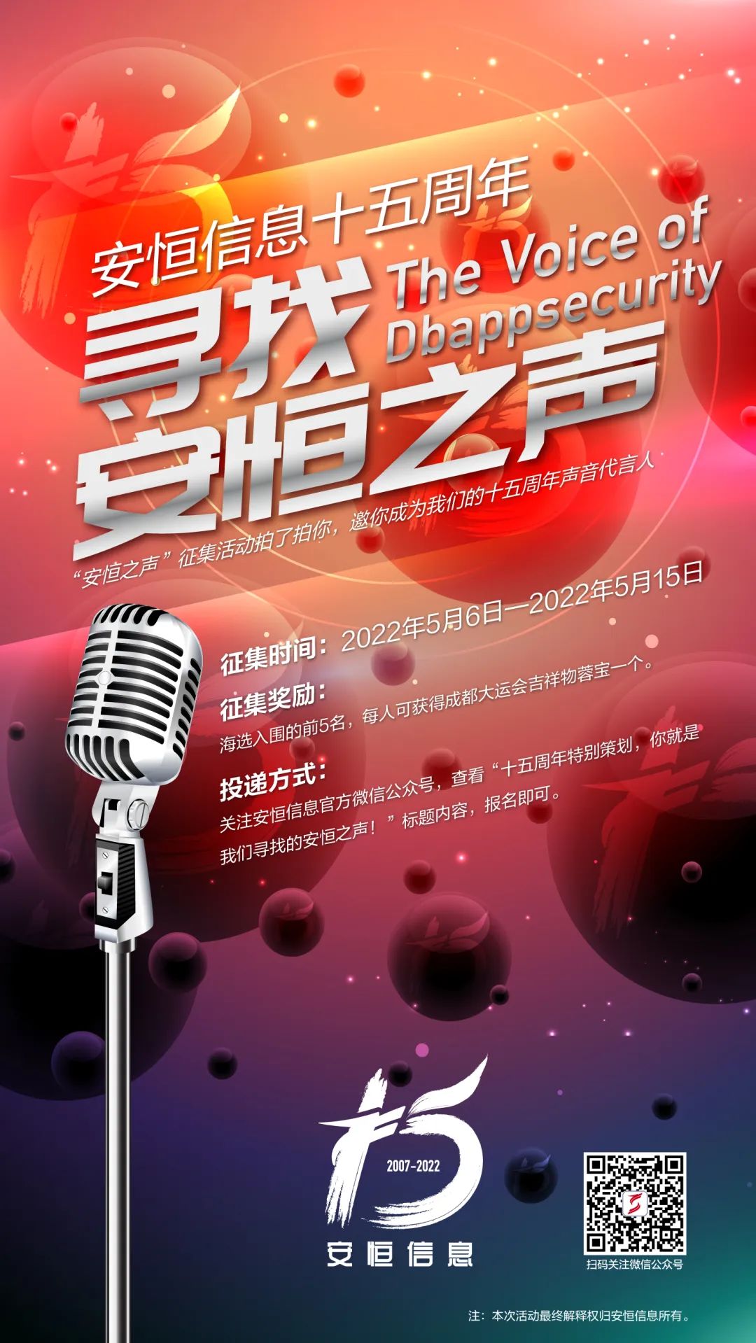 听说你的声音动人心弦,能将故事娓娓道来;听说你的声音铿锵有力,凝聚着年轻人的风发意气。“安恒之声”征集活动拍了拍你,邀你成为我们的十五周年声音代言人,展示青年风采,共同讲述安恒信息的那些年。