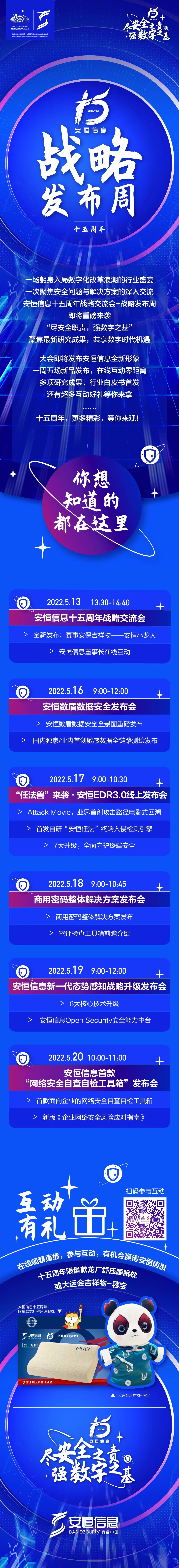 忆往昔,峥嵘岁月十五载;看明朝,持续精进更辉煌。接下来一周将全面启动“2022安恒信息十五周年战略发布周”。届时,安恒数盾数据安全、安恒EDR3.0、安恒信息商用密码整体解决方案、安恒信息下一代态势感知战略升级,以及安恒信息首款网络安全自查自检工具箱等5大“新产品、新方案”将相继对外发布,全面展示安恒信息在创新方面的能力和落地实践。