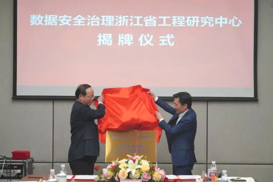 同时,安恒信息与杭电宣布共同成立数据安全治理浙江省工程研究中心,朱泽飞校长和范渊董事长为研究中心的成立揭牌,校企双方将共同推进数字治理体系变革,推动前沿技术创新应用,助力浙江省数据安全治理工作。