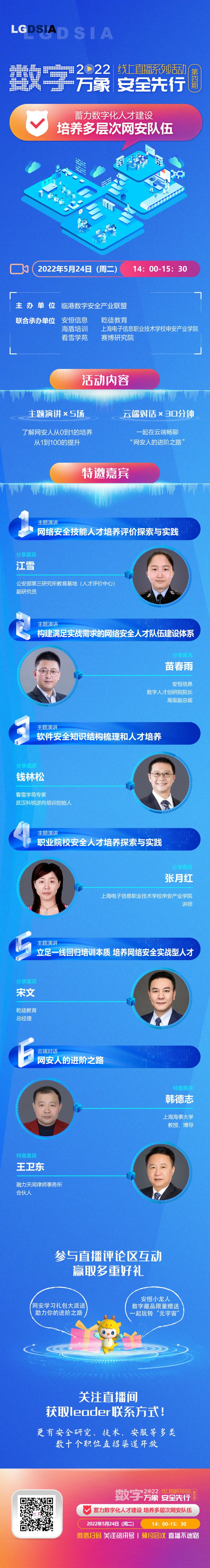 【2022 数字万象 安全先行】线上直播系列活动第四期——网安人才培养专场将于5月24日下午14:00正式开播。本期直播主题为“蓄力数字化人才建设 培养多层次网安队伍”,活动将聚焦网安人才队伍建设,从网络安全产业出发,了解网安人从0到1的学习养成,从1到100的提升培养,打造一支网络安全人才队伍,推动网络安全行业可持续发展,促进数字经济健康发展。