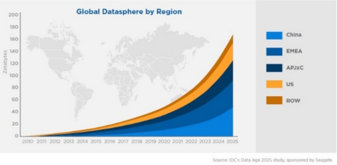 中国作为制造大国,同时也是数据大国。据知名咨询机构IDC预测,2025年全球数据量将高达175ZB(即10243TB),中国数据总量占比将达到27%以上,平均每年的增长速度比全球快3%,中国将成为全球最大的数据圈(数据圈指被创建、采集或是复制的数据集合)。