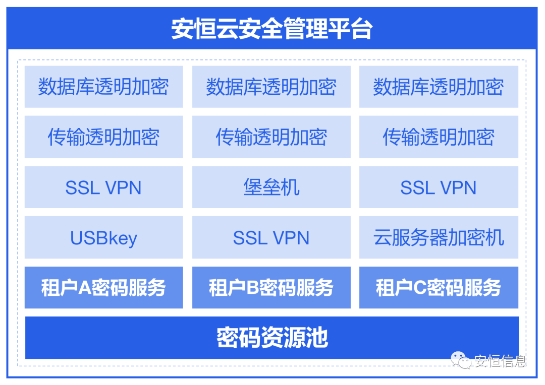 在新标准实施的背景下,安恒云推出密评合规套餐,其中包含国密身份认证系统、传输透明加密系统、数据库透明加密系统、云服务器加密机、国密SSL VPN五款产品,保障基本的密评合规能力。通过建设安恒云密码资源池为云租户提供灵活接入的密码云服务,应用系统低改造接入即可实现合规。