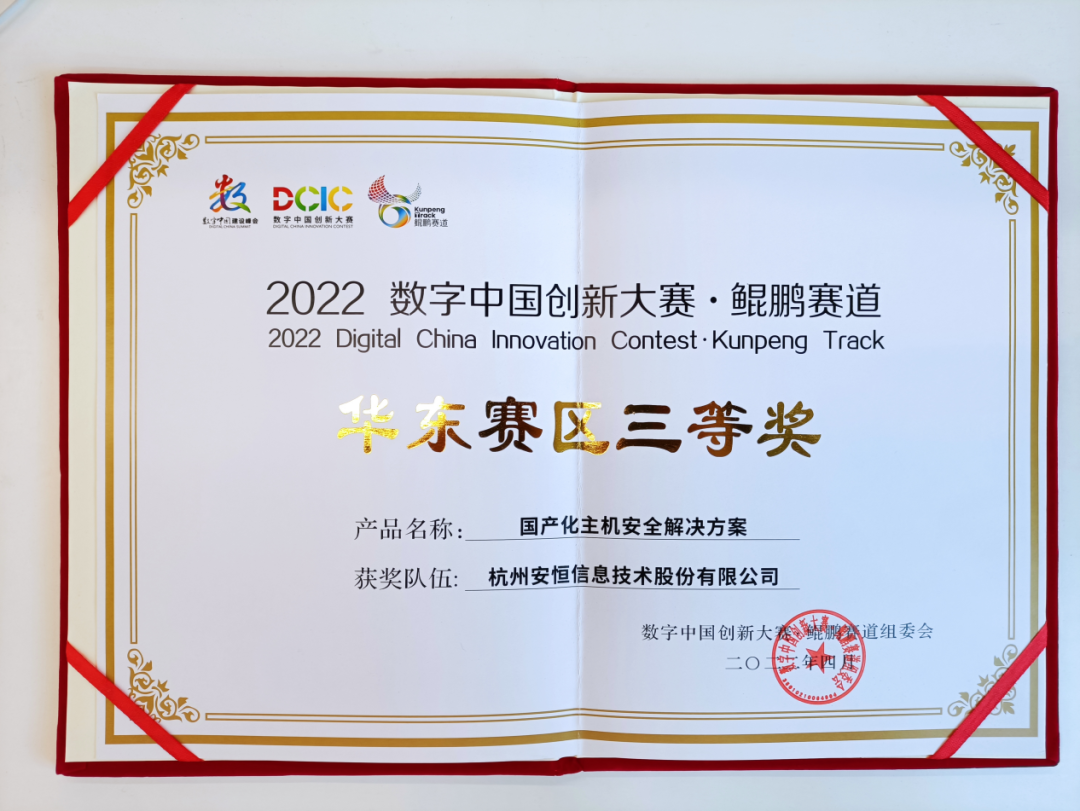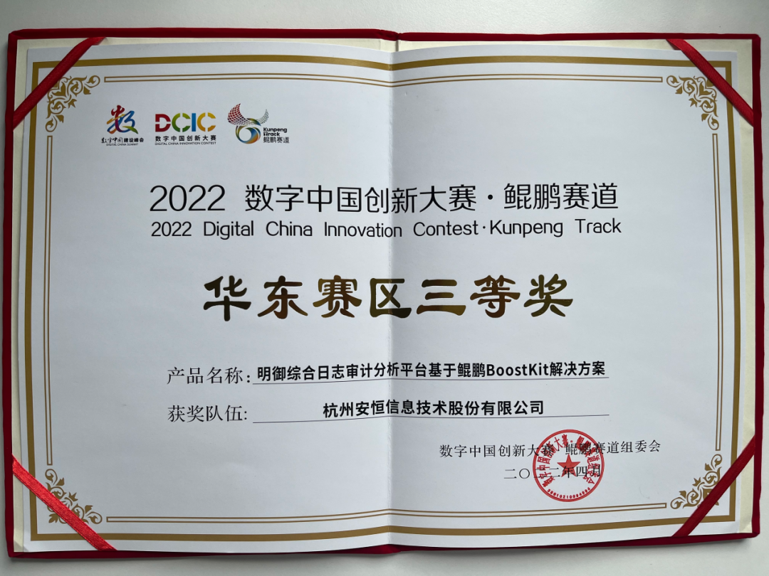 2022数字中国创新大赛·鲲鹏赛道初赛于4月在福州揭幕,大赛从作品的国产支持、核心技术、功能体系等多维度进行评审,安恒信息的3款产品解决方案从160支队伍中脱颖而出,获得华东赛区决赛的晋级资格,分别为:AiLPHA大数据智能安全平台基于鲲鹏Validated的金融解决方案、国产化主机安全解决方案(EDR)、明御综合日志审计分析平台基于鲲鹏BoostKit解决方案。