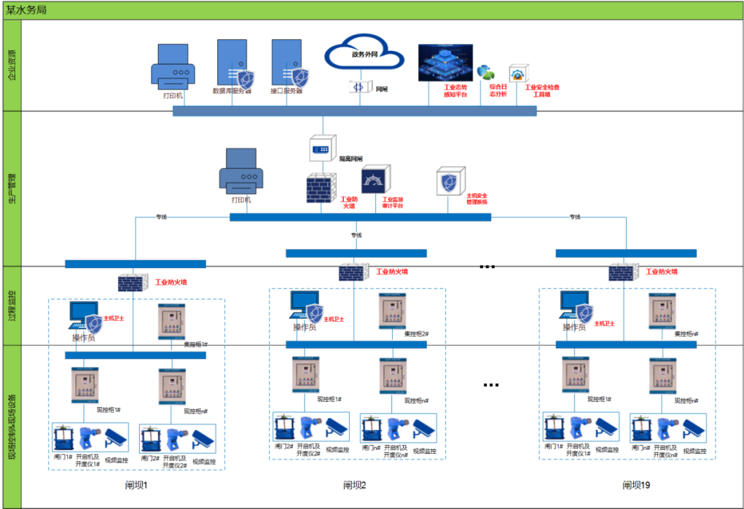 为确保水利业务能稳定安全地开展,山东省某水利工程启动“工控安全等级保护三级建设项目”,对辖区内某河流主河道上的水闸远程控制和现地控制两个层级进行加固,建立工业信息安全整体安全防护体系,保障业务稳定有序开展。