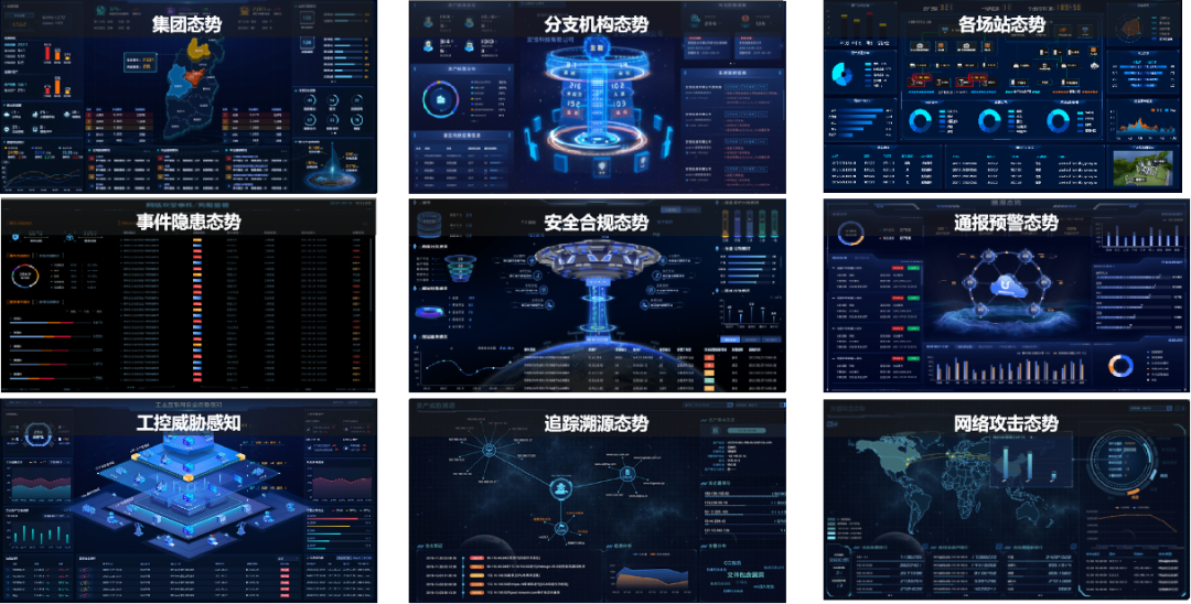 平台对底层监测审计、工业防火墙、主机防护等设备的日志与告警信息进行实时获取和归类整理,将安全告警信息、各类攻击行为与信息、网络威胁信息进行统一集中展示,形成综合态势、攻击态势、威胁态势、预警态势等多种态势感知能力,为某水利工程领导提供工业网络安全决策及应急防护提供依据。