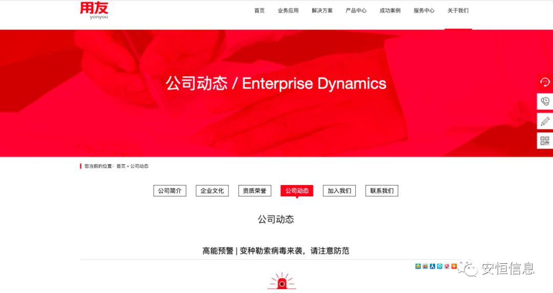 近日,因疑似用友组件漏洞导致勒索病毒爆发的新闻在网上广为流传,并且已经有生产制造企业反馈已经被感染,导致业务中断并被索赔1.5枚比特币。随后用友官网发布了注意防范勒索病毒的公告。
