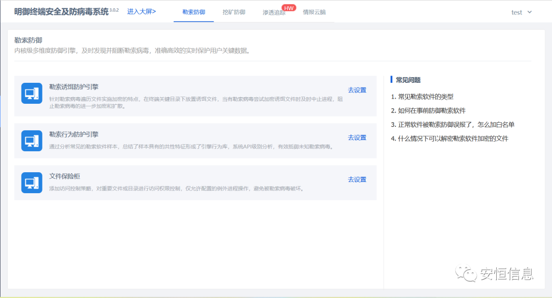 安恒EDR除了能够精准查杀本次突然爆发的该类型勒索病毒外,其针对于勒索病毒的事中防御也同样能够帮助用户终端“免受加密”,当攻击者通过类似此次事件中的利用漏洞或其他绕过防御的方式进行“勒索投毒”之后,仍可凭借“勒索诱饵防护引擎”与“勒索行为防护引擎”在事中针对勒索病毒的加密行为进行有效防护,及时中止勒索行为。
