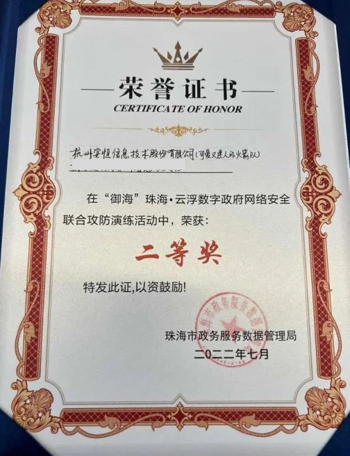 在“御海”珠海·云浮数字政府网络安全联合攻防演练活动中,安恒信息3名一线技术专家组成攻击队,与其他攻击队伍一起,面向珠海和云浮两地110个单位的180个政务互联网应用系统开展大规模实战攻防。凭借深厚的知识积累、扎实的技术功底以及默契的团队协作,在本次演练活动中荣获二等奖。