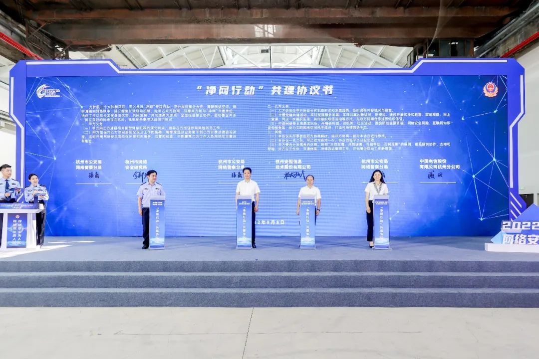 现场,杭州市公安局网警分局和包括安恒信息在内的企业代表现场举行“净网行动”共建签约仪式,加强警企合作,进一步提升广大人民群众在网络空间的获得感、幸福感、安全感。