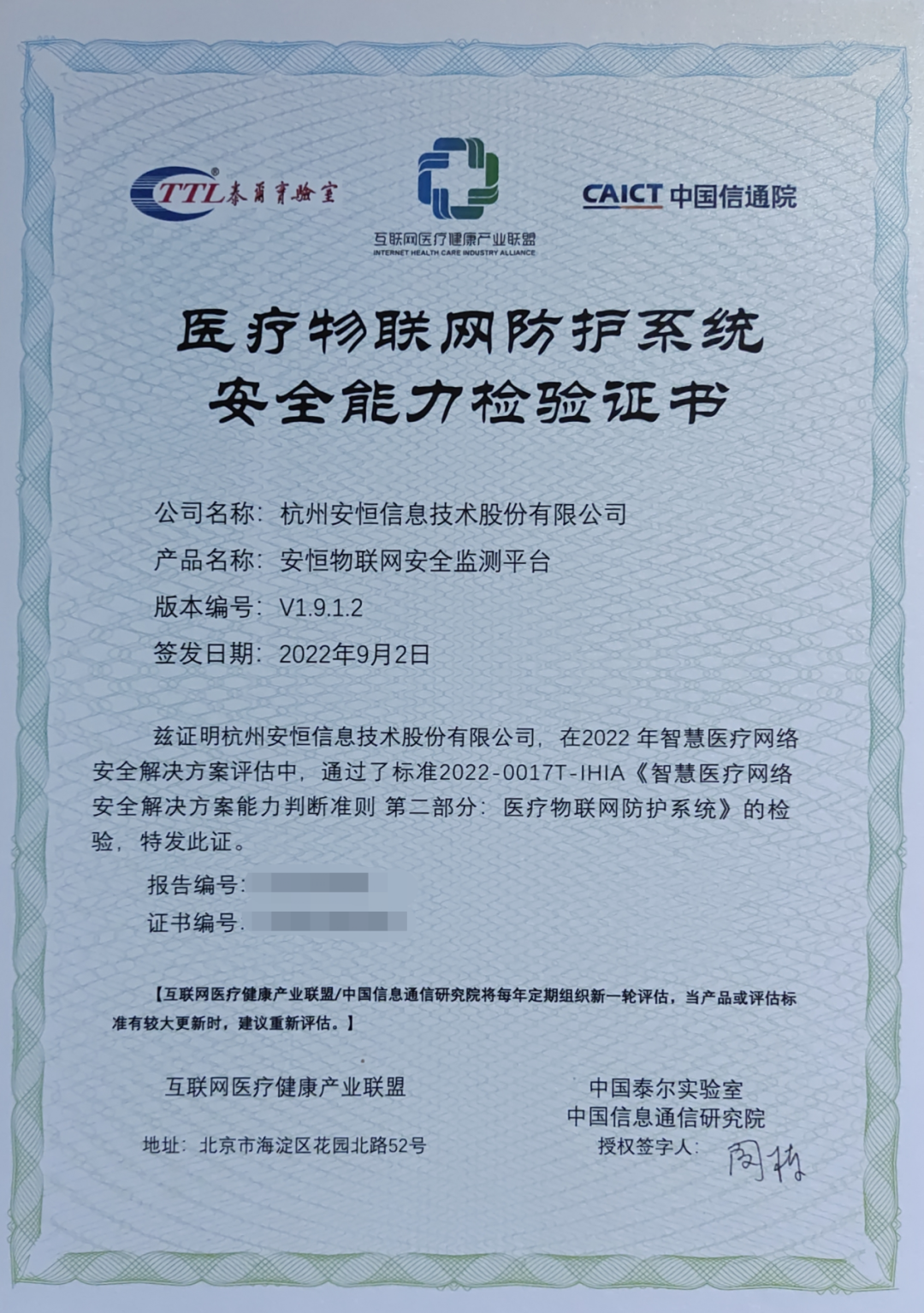 首家!获中国信通院《医疗物联网防护系统安全能力检验证书》