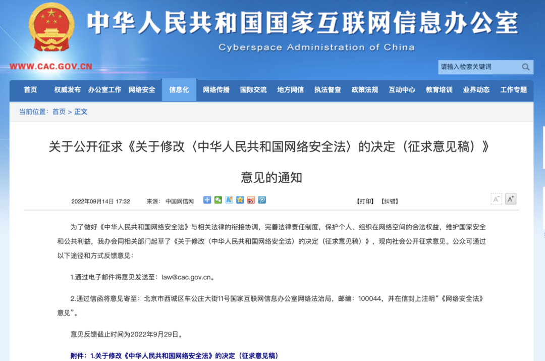 新华社北京9月14日电 为了做好网络安全法与相关法律的衔接协调,完善法律责任制度,保护个人、组织在网络空间的合法权益,维护国家安全和公共利益,国家网信办会同相关部门起草了《关于修改〈中华人民共和国网络安全法〉的决定(征求意见稿)》并于14日公布,向社会公开征求意见。