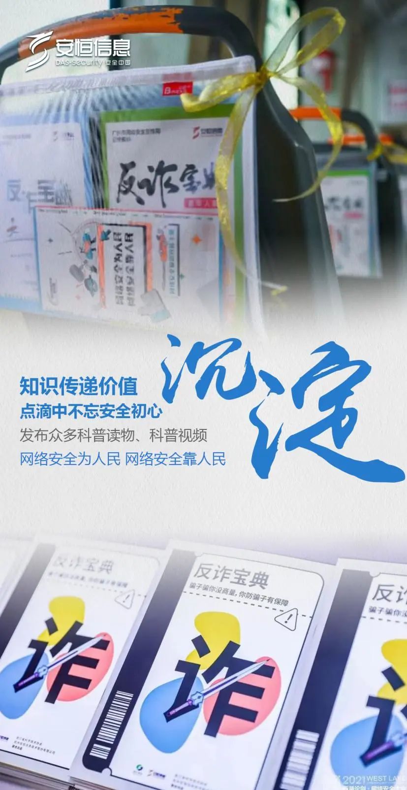 安恒信息发布《三防手册(个人版》《三防手册(企业版)》《反诈宝典》《青少年网络安全读本》等多套网络安全科普读物,打造“一个懂安全的朋友-龙仔说反诈”、“李白杜甫奇遇记”系列科普视频等,通过图文、视频、创意游戏的方式在全国范围内传播。
