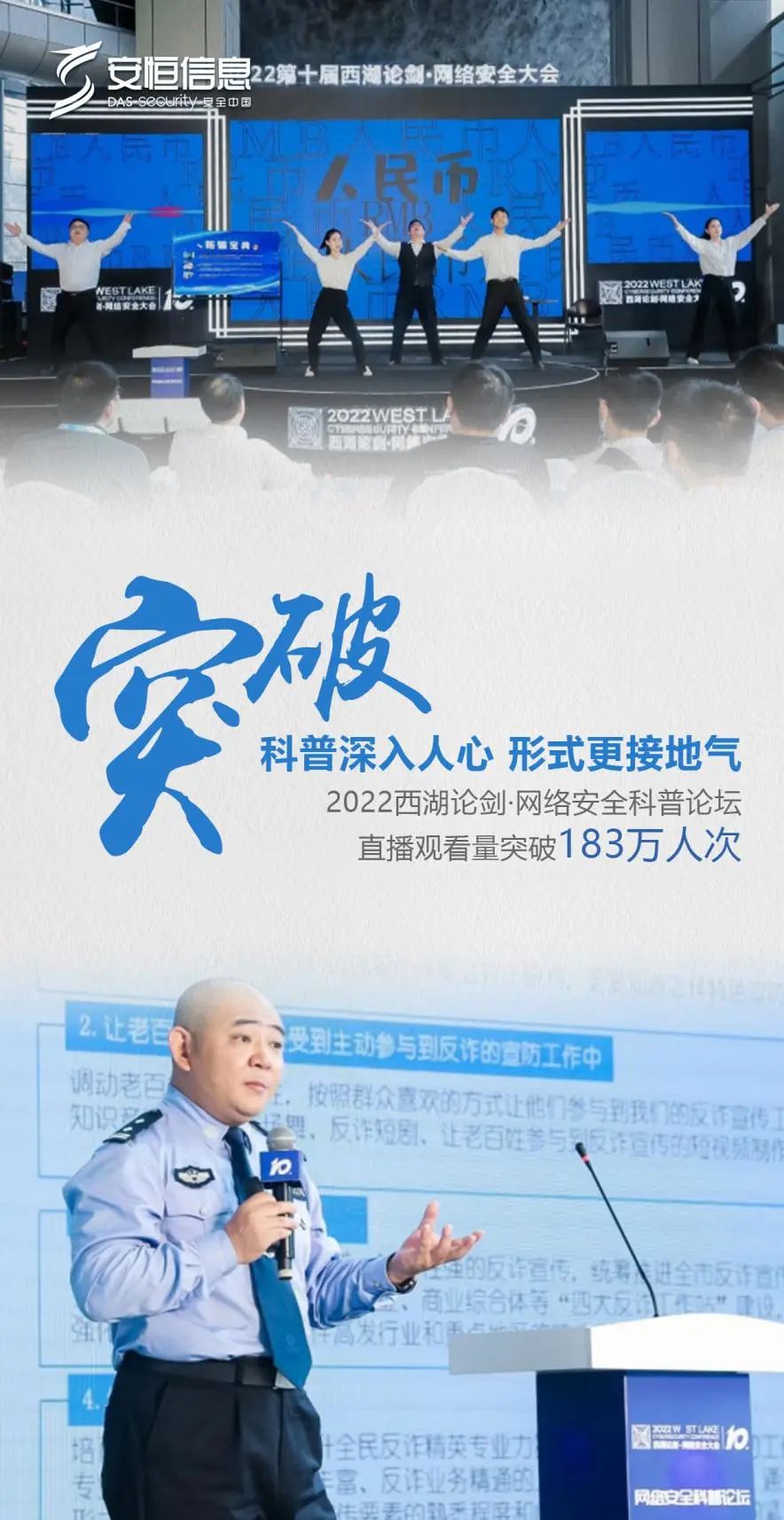 在2022西湖论剑·网络安全科普论坛的现场,涌现出多种多样的反诈宣传形式:网红民警刘杰臻(光头刘sir)的脱口秀,诙谐幽默地介绍常见的电信网络诈骗的手段以及防范的方式;省科协、浙江演艺集团钱江浪花艺术团联合打造科普情景剧《别想骗我人民币》,将喜剧表演形式与反诈科普知识进行有机结合......活动现场反响热烈,线上观看人数也再创新高。