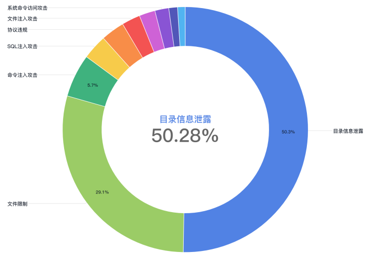 上图是对一个网站每天遭受攻击类型做的统计,可以看到超过50%的攻击属于目录信息泄露,还有近30%的攻击属于文件限制,都是攻击者在信息收集时使用的手段。