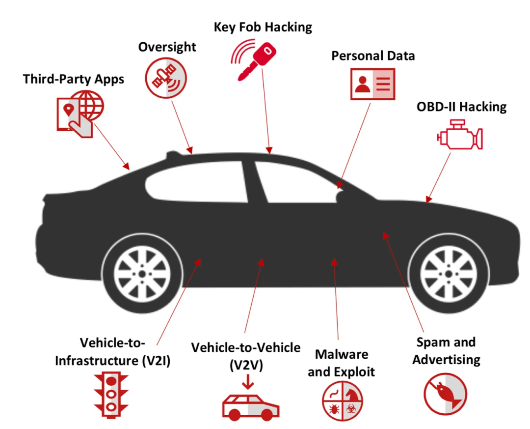 车联网面临的安全威胁是来自多方面的,可能来自云端、无线传输、物理接口、客户篡改、固件逆向等攻击。