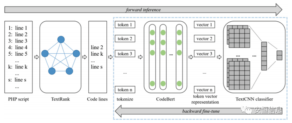 结合textcnn结构的分类head,模型的整体为一个two-stage的架构,loss在textcnn和codebert中进行反向传播,而textrank模型不参与误差的反向传播。