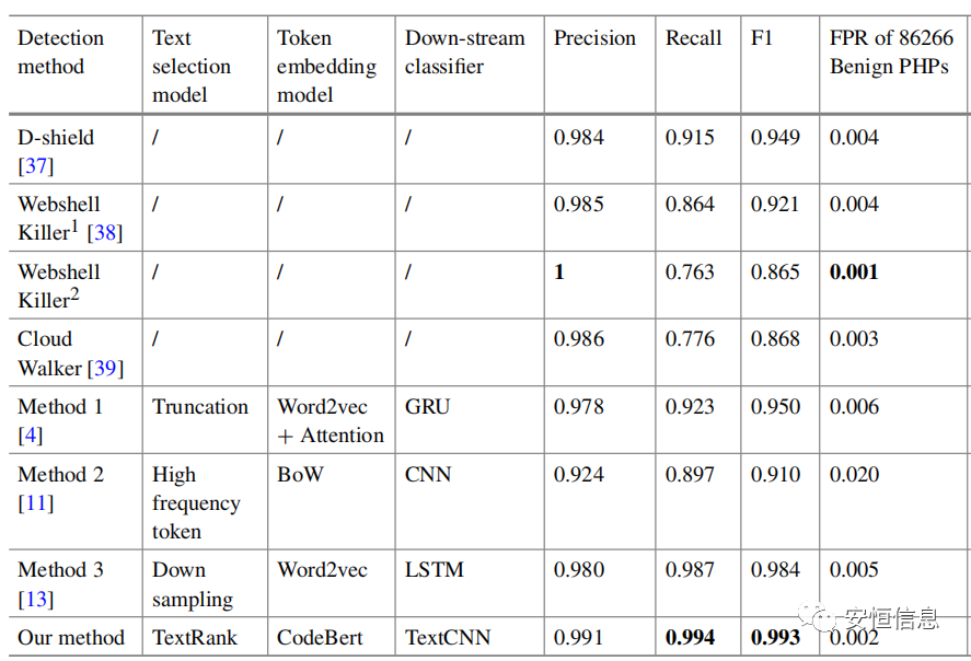 模型经过数十epoch的训练,在数十万样本的测试中,其综合表现F1-score超过了3种webshell检测工具和3种基于深度学习的webshell检测模型。在达到较高检出率的同时,也保证了较低的误报率。