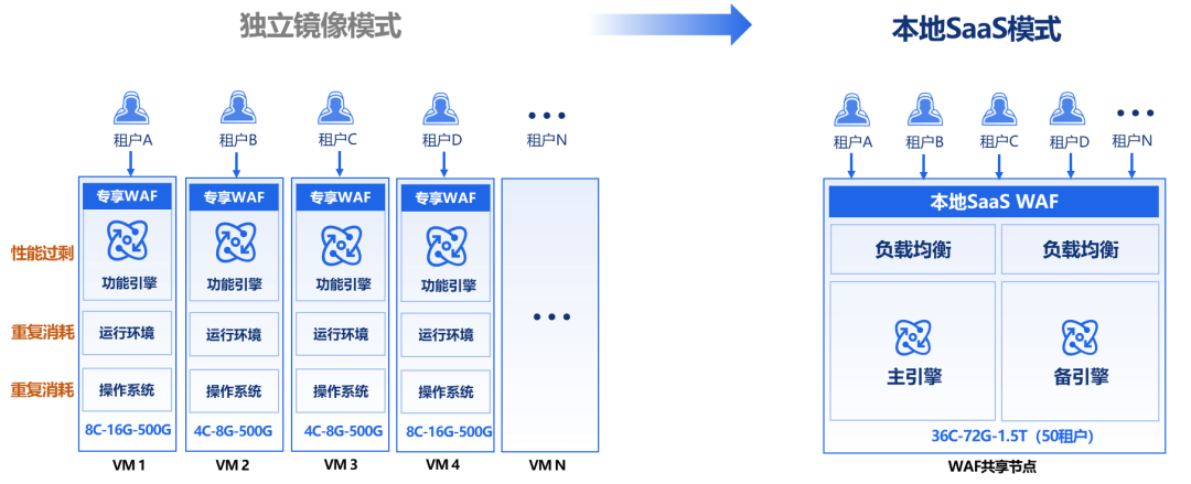 以50个租户使用WAF产品为例,传统方式需要开通50台安全虚拟机总计占用200vCPU、400G内存、27T磁盘,而采用本地SaaS架构仅需要部署一套WAF产品占用36vCPU、72G内存、1.5T磁盘,整体资源节省80%以上,同时后期仅维护一套本地SaaS平台可有效控制运维成本,充分彰显降本提效的理念。