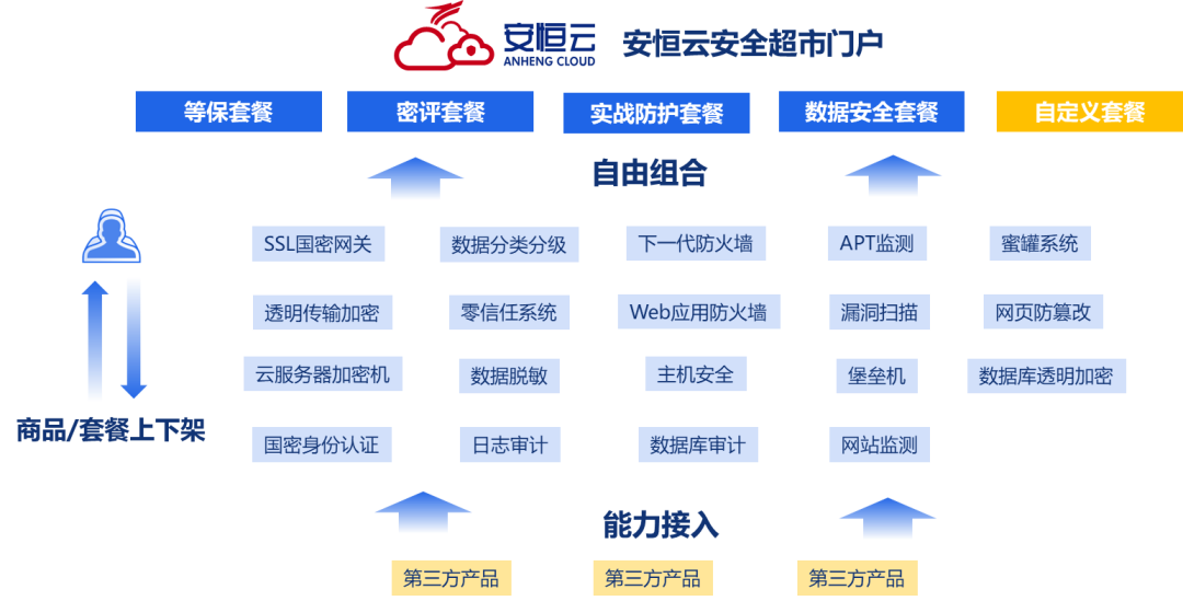 对此,安恒云-天池云安全管理平台整合自身安全能力,为云租户打造云上“安全超市”,实现云安全能力的一站式提供。首先,超市内安全能力种类丰富,除了基础的等保合规类能力外,同时包括了数据安全类、密评合规类、攻防实战类等共计20余种安全能力,充分满足业务上云后的多样化安全需求。在此基础上,云平台管理员同样可基于租户共性化的业务需求,将不同种类、规格的安全产品进行打包组合形成产品套餐,供租户一键订购快速接入,简化产品开通流程。如云租户存在个性化安全需求,安全超市同样支持第三方能力接入,并提供与默认安全能力相同的开通和使用体验,构建开放、互补的云上安全生态。