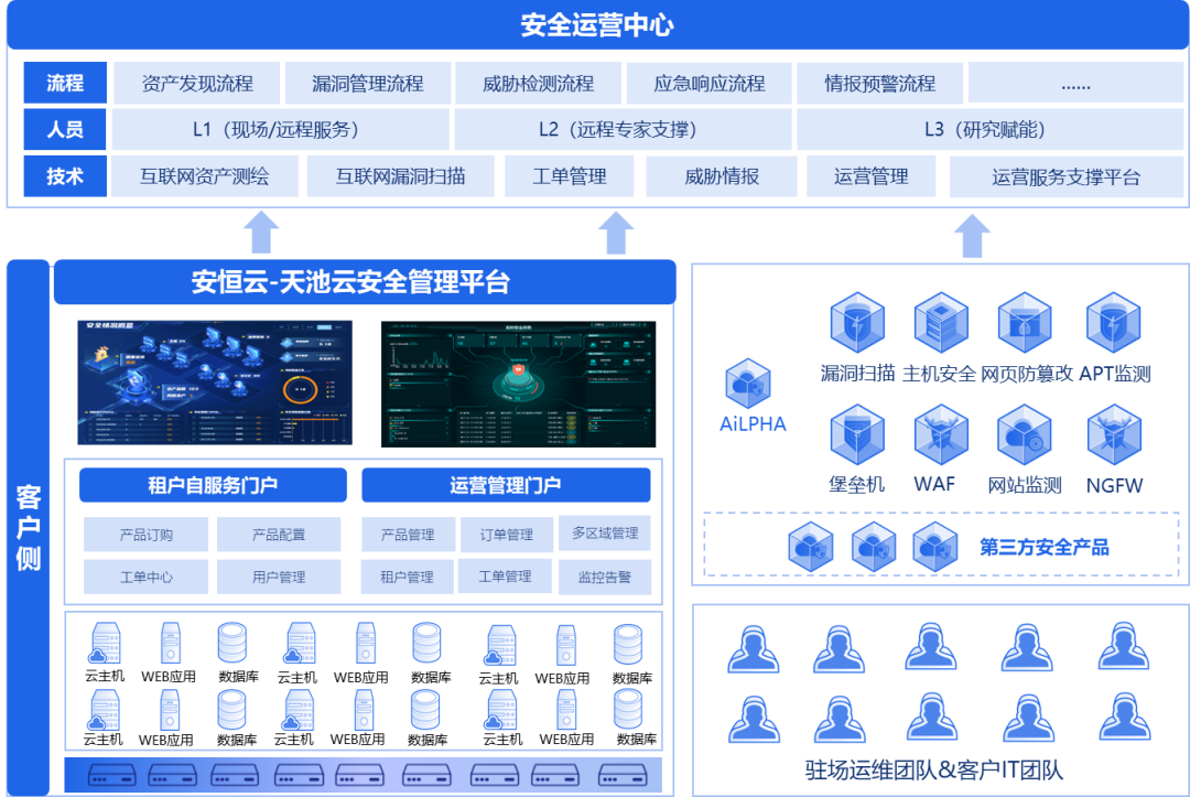 如同政务云平台自身一样,云安全也同步进入精细化运营阶段。安恒信息可在完成安全能力建设后,建设技术、人员、流程相结合的安全运营中心,打造有效、主动、闭环的安全运营体系。