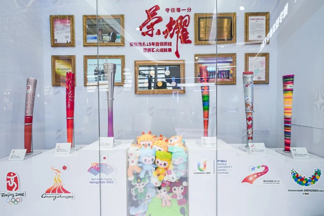 在安恒信息展位,有一处风景格外吸睛。由杭州亚运会火炬“薪火”、成都大运会火炬“蓉火”领衔的六大国际赛事火炬集中亮相。据了解,这在国内尚属首次。2008年,我们以专业的技术完成了北京奥运会/残奥会信息网络安全保障工作,从此一战成名。之后又陆续支撑了广州亚运会、深圳大运会、武汉军运会、成都世乒赛等国际大型体育赛事网络安全保障工作。现在,安恒信息也是成都大运会网络安全类官方独家供应商以及杭州亚运会官方网络安全服务合作伙伴。这6只火炬,是体育精神的延续,也是网络安保精神的延续。守住每一分荣耀,实现安保实战“零失误”,是所有安恒人内心的笃定。
