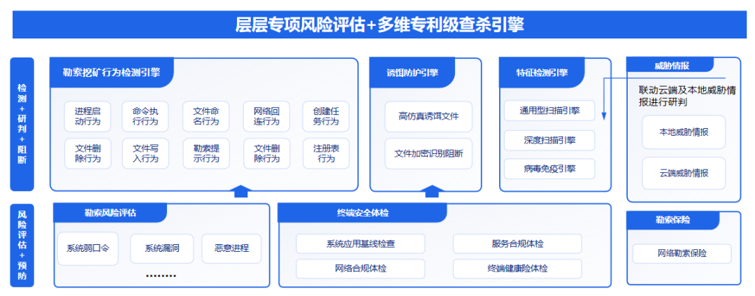针对当前的头号威胁——勒索病毒,提出检测、预防、防御、响应、溯源、加固全闭环的一体化解决方案,并且创新性的提出了勒索诱饵防护及文件保险柜等防护能力,精准阻断未知勒索病毒,并做到数据可用不可改;