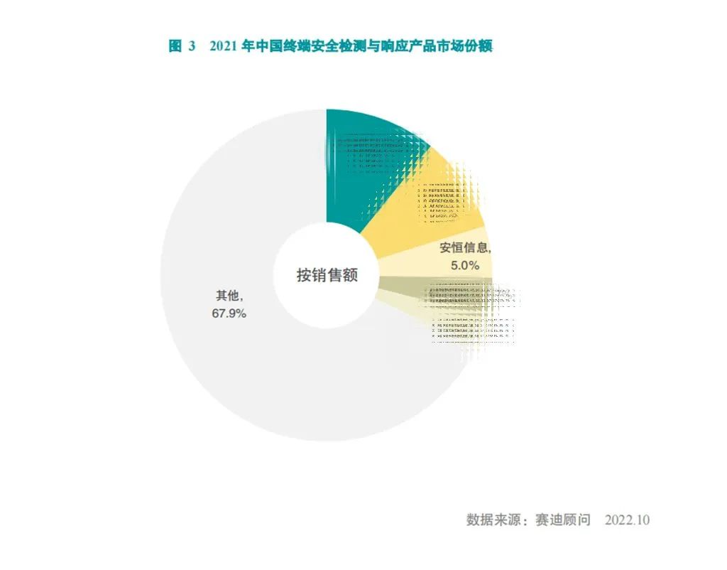 在国内权威咨询机构赛迪顾问本年度发布的中国终端安全检测与响应产品市场研究报告,安恒信息明御终端安全及防病毒系统(安恒EDR)排名第三(占全国市场份额的5%)。