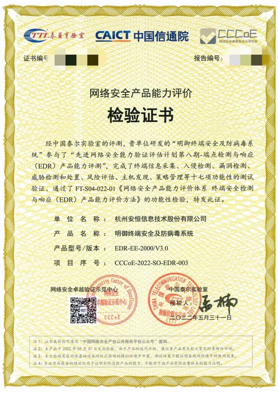 以出色的产品硬实力率先通过了先进网络安全能力验证评估计划-端点检测与响应(EDR)产品能力评测,并获得信通院泰尔实验室颁发的荣誉证书。