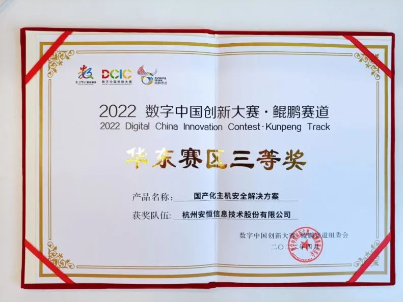 基于安恒EDR终端防御能力打造的“国产化主机安全解决方案”荣获2022数字中国创新大赛鲲鹏数字创新大赛三等奖。