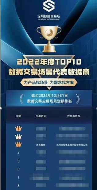 2023年1月,深圳数据交易所重磅发布《2022年度十大数据交易应用场景代表数据商榜单》,安恒信息的政务服务场景位列第三。