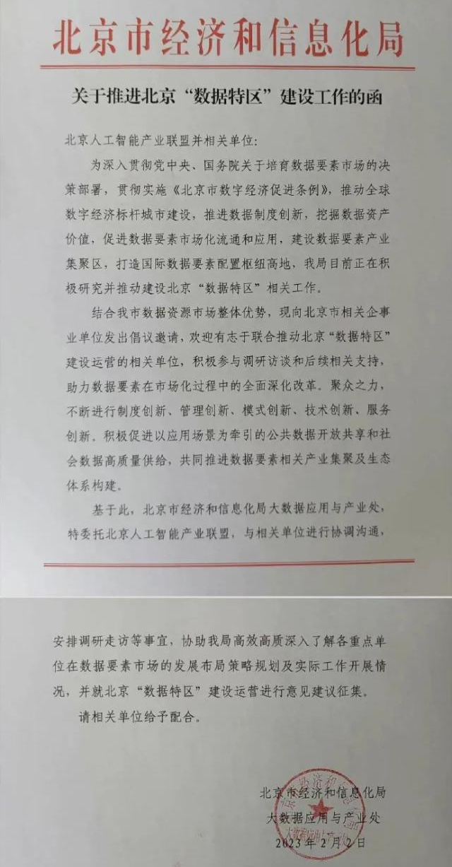 同时,有接近北京市经济和信息化局的人士透露,正在研究推动建设北京数据特区工作,目前已下发征求相关意见函件。