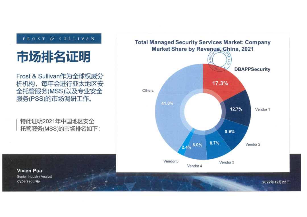 近日,Frost & Sullivan发布《Asia Pacific (APAC) Managed and Professional Security Services Market》报告(以下简称《报告》),对中国地区安全托管服务(MSS)进行了深入研究。《报告》显示,安恒信息凭借技术优势和专业服务,以17.3%的市场份额位列2021年中国地区安全托管服务(Managed Security Services,MSS)第一名。